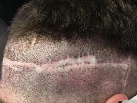Follicular unit transplantation (FUT) involves removing a thin strip of scalp. After the doctor closes the area, a linear scar forms. Surgeons use strong stitches, so the skin joins tightly together. This technique leaves a long line, and the mark fades slowly, and hair growth around the incision conceals the healed tissue. Because the skin stretches naturally, the line might widen over time.